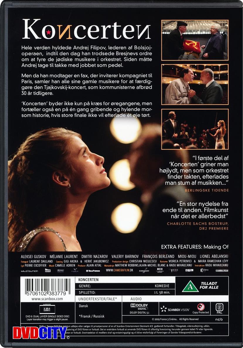 | Beskrivelse: [ Dansk Engelsk ] Bolsjoj Teatrets feterede dirigent Andrei Filipov er faldet i unåde under kommunismen, fordi han har nægtet at rense sit orkester for jøder og andre folkefjender. Siden er Andrei blevet ansat som vicevært på sin gamle arbejdsplads, og det er her, at han ved et tilfælde ser, at orkestret er inviteret til at optræde på Châtelet Teatret. Andrei griber muligheden og samler sit gamle orkester på ægte Buena Vista Social Club-manér, men dermed er hans lykke ikke gjort, for det kræver mere end almindelig snilde, hvis de vordende værtsfolk i Paris skal undgå at opdage svindelnummeret. "Koncerten" byder ikke kun på kræs for øregangene, men fortæller også en på én gang gribende og hylende morsom historie, hvis store finale ikke vil efterlade ét tørt øje i biografen. Beskrivelse: [ Dansk Engelsk ] Russian-French comedy drama. Aleksei Guskov stars as Andrei Filipov, a once-celebrated conductor of the prestigious Bolshoi Orchestra who was sacked from the post 30 years previously for hiring Jewish musicians, and has worked in the menial role of janitor in the Bolshoi Theatre ever since. When he happens upon an invitation from Paris for the Bolshoi Orchestra to play there, he hijacks the gig and assembles his own motley team of musicians for a whirlwind three-day trip that they will never forget. Melanie Laurent and Valeriy Barinov co-star. |