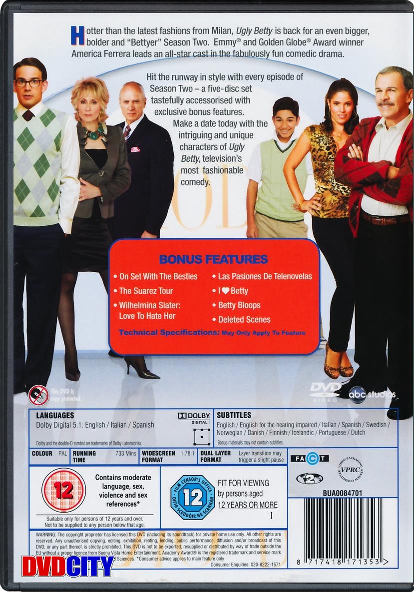 Hit the runway in style with every episode of Series Two - a five-disc set tastefully accessorised with exclusive bonus features. Make a date today with the intriguing and unique characters of Ugly Betty, television's most fashionable comedy.