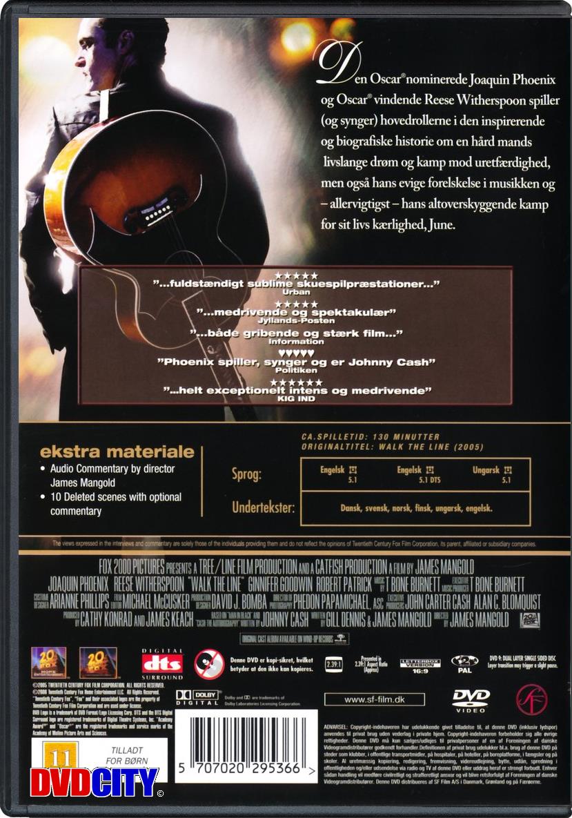 Beskrivelse: [ Dansk Engelsk ] Drama following the life of the legendary 'Man in Black', Johnny Cash. The movie begins in 1955, when a tough, skinny guitar-slinger who called himself J.R. Cash (Joaquin Pheonix) walks into the soon-to-be-famous Sun Studios in Memphis. It was a moment that would have an indelible effect on American culture. With his driving freight-train chords, steel-eyed intensity and a voice as deep and black as night, Cash sang blistering songs of heartache and survival that were gutsy, full of real life and unlike anything heard before. That day kicked off the electrifying early career of Johnny Cash. As he pioneered a fiercely original sound that blazed a trail for rock, country, punk, folk and rap stars to come, Cash began a rough-and-tumble journey of personal transformation. In the most volatile period of his life, he evolved from a self-destructive pop star into the iconic 'Man in Black' - facing down his demons, fighting for the love that would save him time and again, and learning how to walk the razor-thin line between destruction and redemption. Reese Witherspoon won a Best Actress Academy Award for her role as June Carter, Cash's long-suffering wife. | Ekstra features: