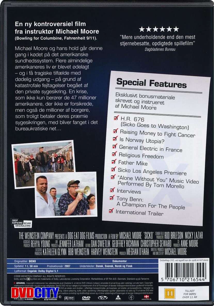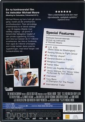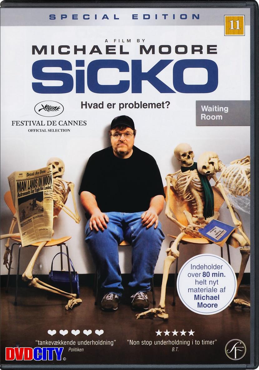 | Beskrivelse: [ Dansk Engelsk ] Filminstruktøren Michael Moore går igen i kødet på magthaverne i USA. Denne gang i en film om det amerikanske sundhedssystem, der ikke ser for godt ud i forhold til lande som England, Frankrig og Cuba. Flere end 900 lobbyister får deres navn i både tabloidaviser og den meget velrenommerede 'The Washington Post i forbindelsen med premieren. Og det er ikke for det gode deres navn bliver nævnt. Instruktøren Michael Moore inviterer de registrerede lobbyister til gratis at se hans seneste film 'SiCKO', der er et angreb på netop deres arbejde. Moore risikerer, at SiCKO bliver forbudt i USA - fordi en lille del af den, er optaget på Cuba, hvilket af nogen opfattes som en overtrædelse af den amerikanske embargo mod øen. Beskrivelse: [ Dansk Engelsk ] Academy Award winning filmmaker Michael Moores new movie SiCKO asks his fellow Americans -What is wrong with us? Moore shows that U.S. health care ranks last among developed nations despite costing more per person than any other health system in the world. Moore seeks answers in Canada, Great Britain, and France, where all citizens receive free medical care. Finally, Moore gathers a group of 9/11 heroes rescue workers now suffering from debilitating illnesses, unable to receive help at home, and takes them to a most unexpected place where they receive the tender care unavailable in the richest nation on earth.